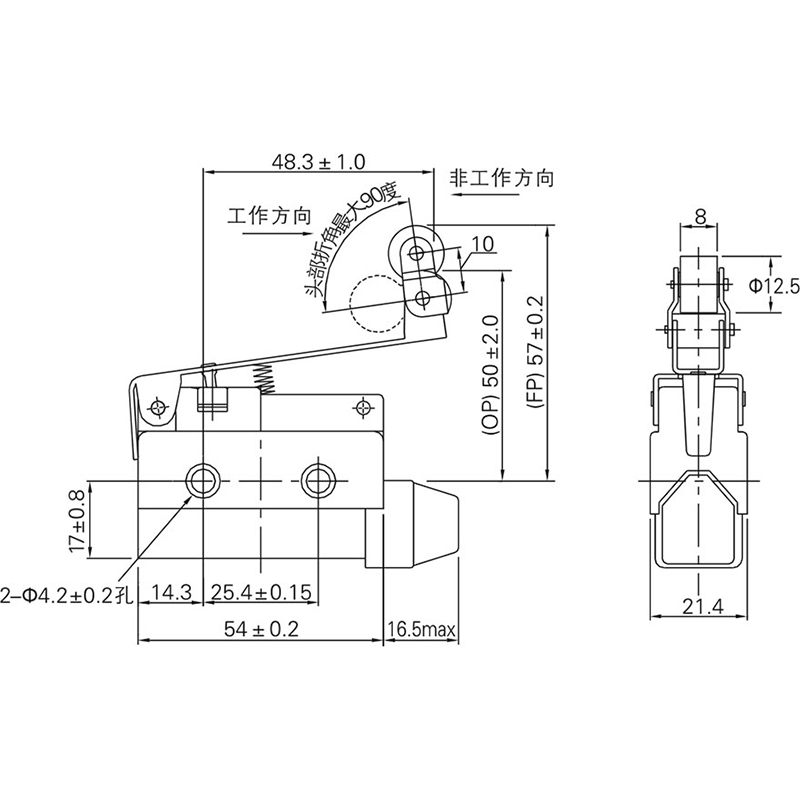 安裝孔間距為25.4mm,與RZ型微動(dòng)開(kāi)關(guān)相同。